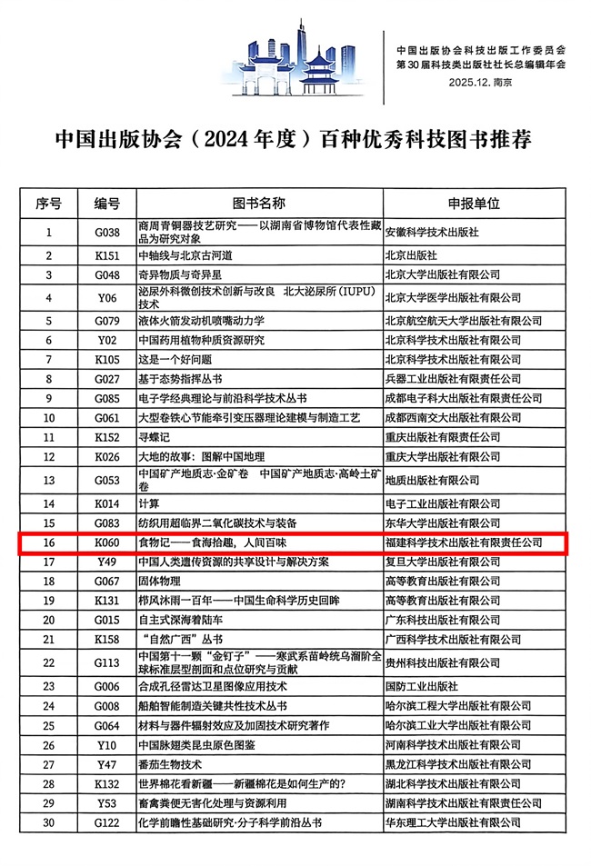 2025年12月6日,在南京舉行的“中國(guó)出版協(xié)會(huì)科技出版工作委員會(huì)第30屆科技類出版社社長(zhǎng)、總編輯年會(huì)”上,“中國(guó)出版協(xié)會(huì)(2024年度)百種優(yōu)秀科技圖書(shū)”推薦書(shū)目正式發(fā)布。福建科學(xué)技術(shù)出版社出版的《食物記——食海拾趣,人間百味》憑借深厚的文化底蘊(yùn)、嚴(yán)謹(jǐn)?shù)目茖W(xué)闡述與生動(dòng)的敘事表達(dá)成功入選,成為全國(guó)優(yōu)秀科技圖書(shū)中代表科普創(chuàng)作高度的精品之作。